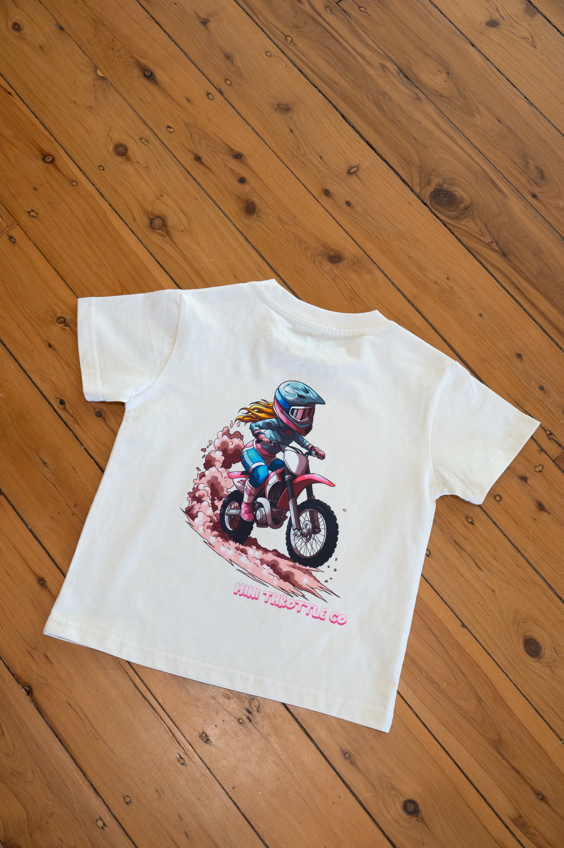 This one’s for the girls who run the track, the playground, and everything in between. With “Mini Throttle Queen” printed on the front left chest in fierce pink and a bold graphic of a moto-riding girl on the back, this tee brings all the power.